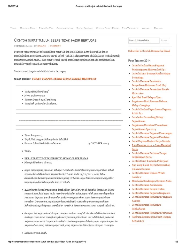 Cuma ada sebab tersendiri dan bersifat peribadi. Contoh surat tunjuk sebab tak hadir kerja lewat ke tempat kerja tak hadir kursus lain lain edu bestari surat petunjuk kerja . Bukan tidak mahu hadir kursus atau mesyuarat . Contoh surat tunjuk sebab tak hadir kerja lewat ke tempat . Sebagai seorang pekerja, situasi seperti di atas pasti pernah berlaku pada diri anda.